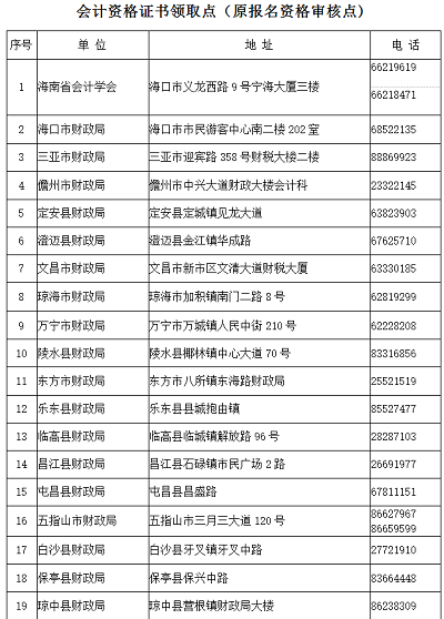 2022年度全國會計專業技術初級資格考試海南考區“會計專業技術初級資格證書”將于2022年12月27日開始發放。全科考試成績合格且報名資格審核通過的考生,請攜帶本人有效居民身份證件到會計資格證書領取點(原報名資格審核點)領取證書(法定節假日除外,原報名資格審核點為洋浦開發區財政局的考生請聯系儋州市財政局領取)。各會計資格證書領取點地址及聯系電話如下: